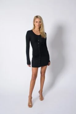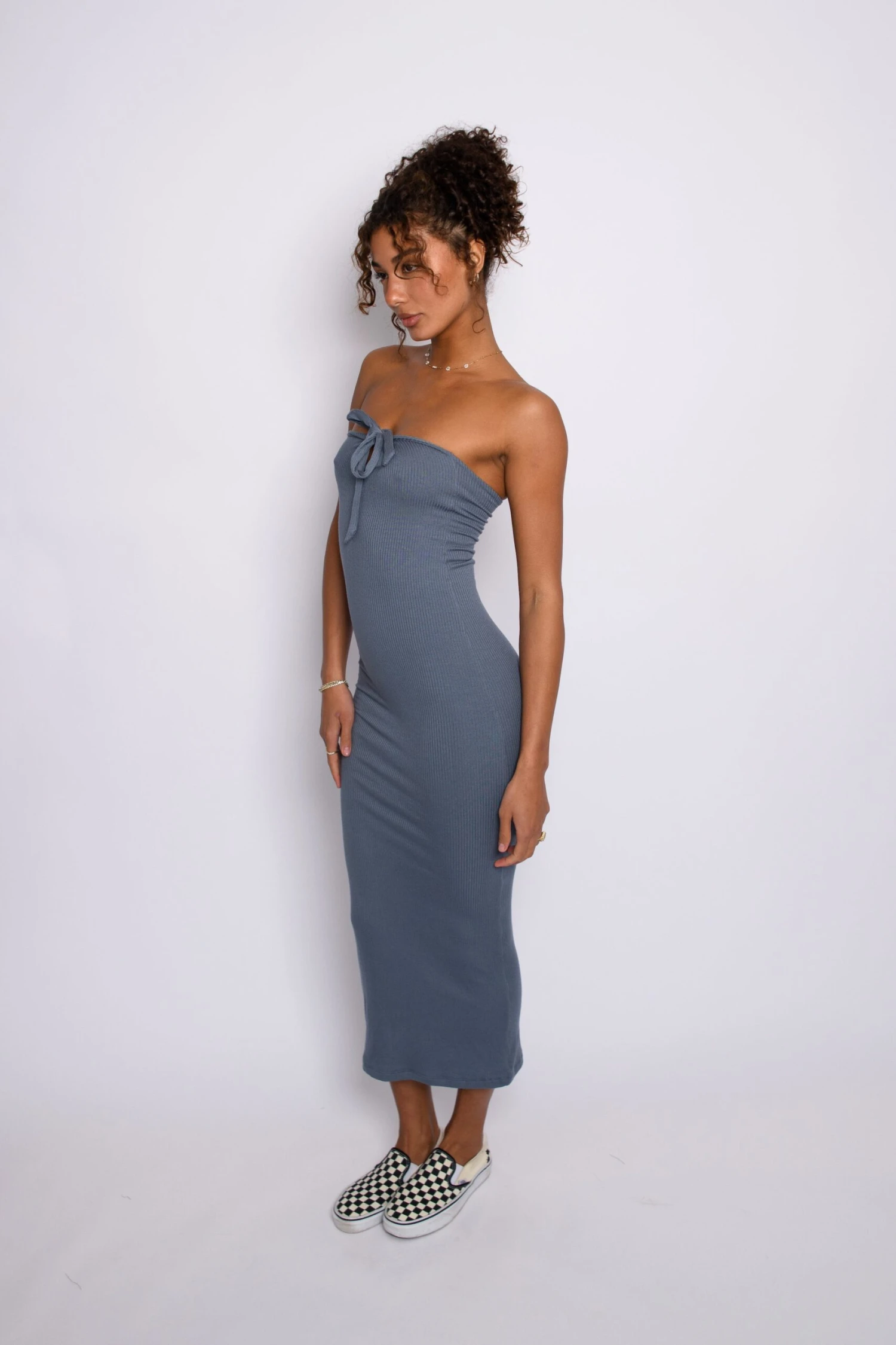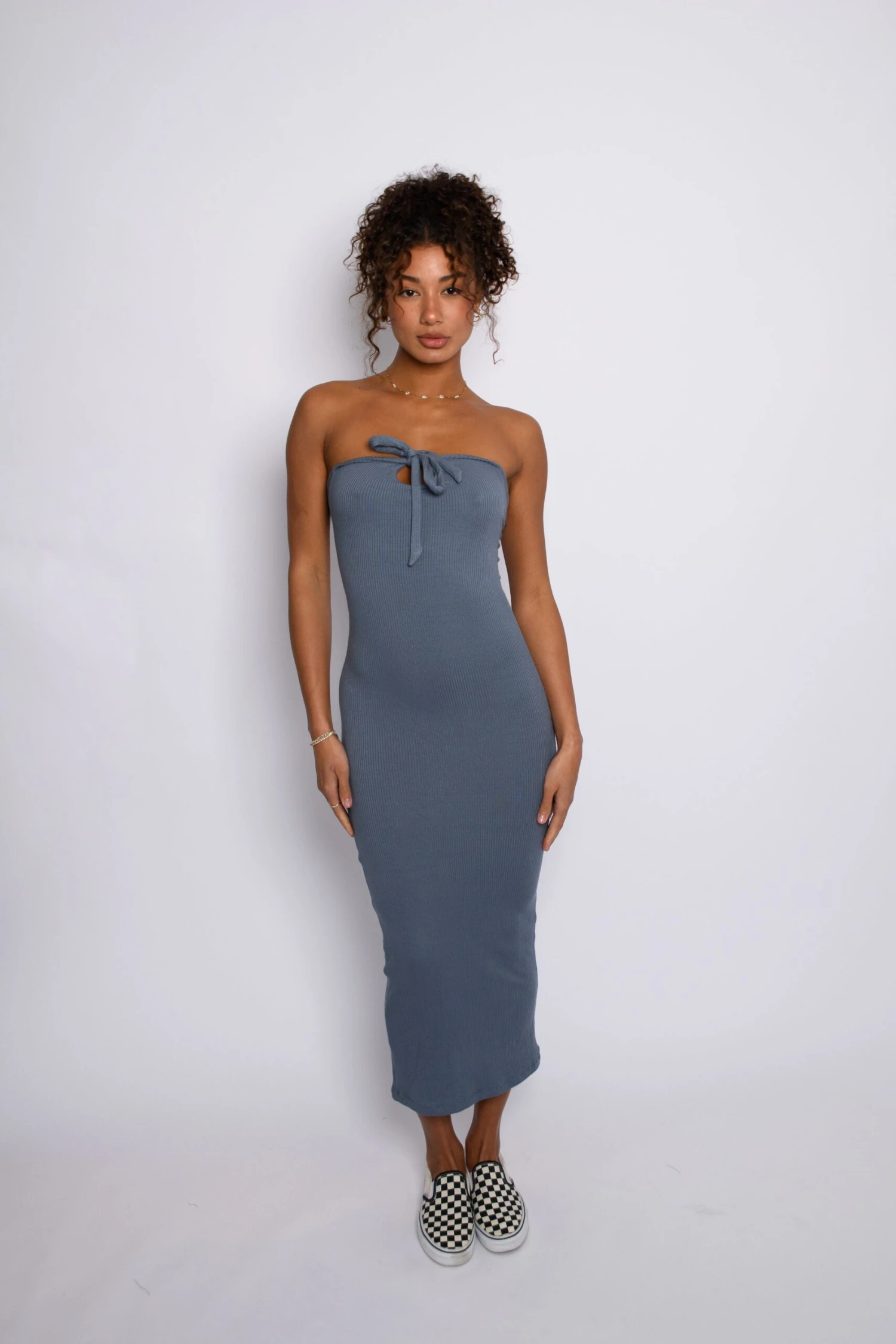 This maxi form fitting dress has a top that can be worn multiple ways. Tied around your neck in a keyhole or halter style in the front or tie it in the front for a classic tube top. Dress her up or down, she is chic enough to wear to a wedding, but comfortable enough to throw on and wear at home.Â