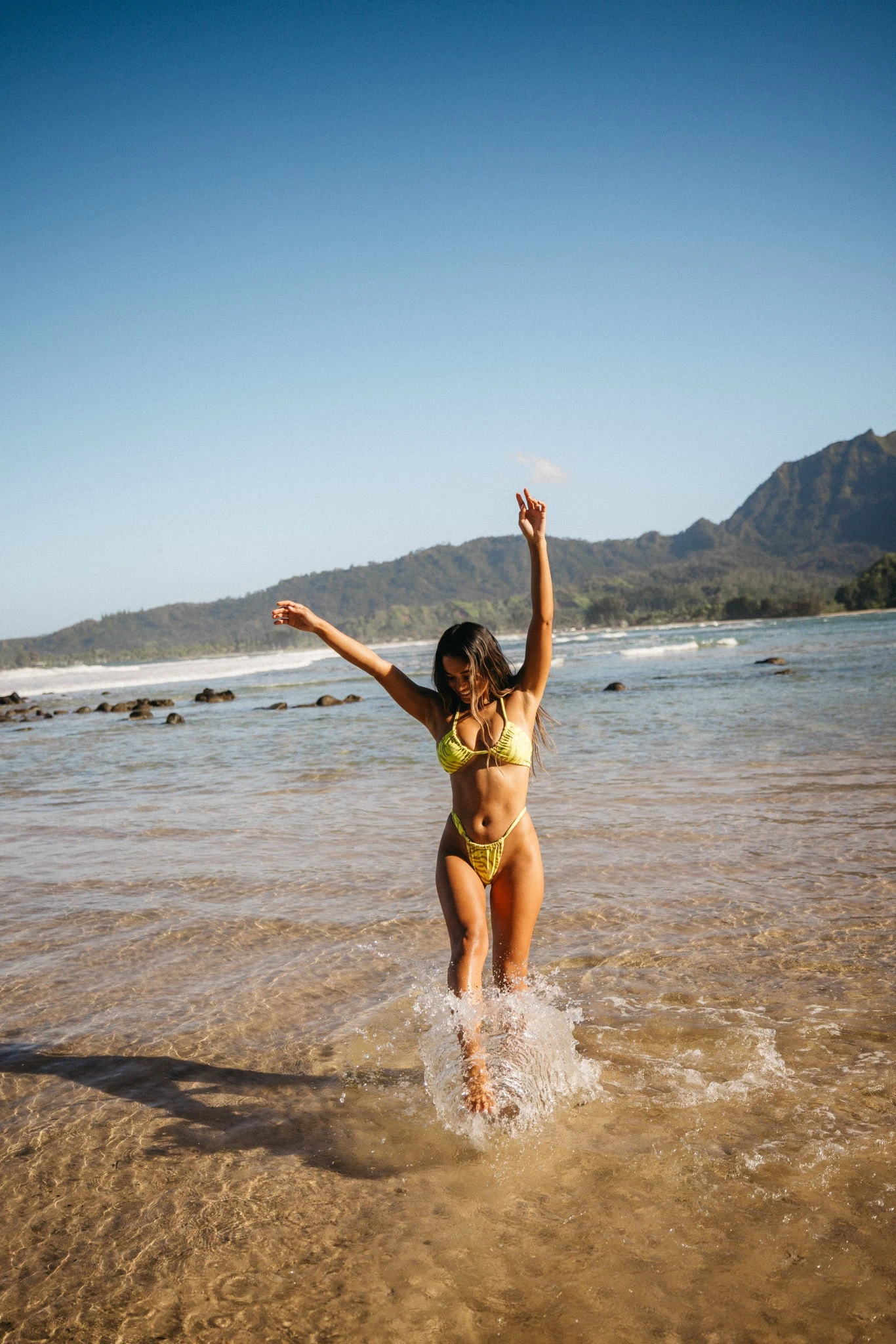 Calling all fans of Ella! Darby is a sliding triangle top with a halter neck and thicker, more supportive straps. Her knotted ties add a fun twist to a classic shape, and her adjustable fit makes sure you’re looking and feeling good!